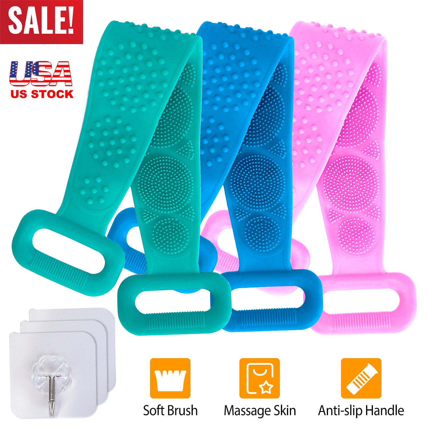 Silicone Back Scrubber Belt For Shower Exfoliating Foaming Body Wash Strap Brush Bristles Massage Dots W/ Adhesive Hook